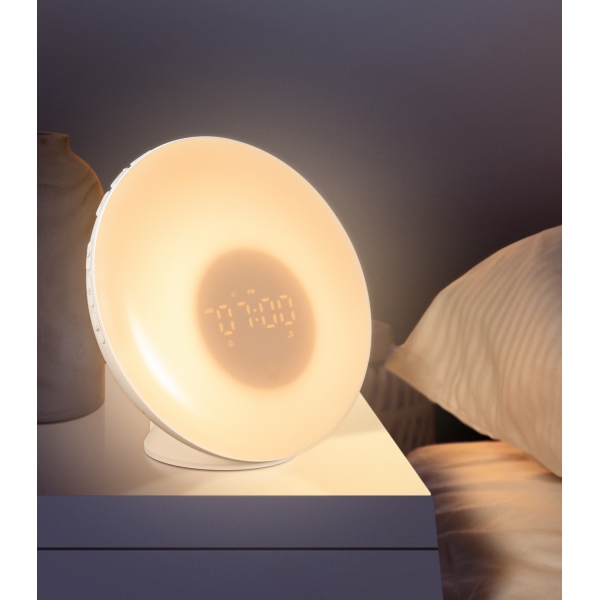 Svetlobna budilka WL-100C je simulator sončnega vzhoda in simulator sončnega zahoda. Tako kot pravi sončni vzhod se svetlost v obdobju 30 minut postopoma povečuje, dokler vaše sobe povsem ne osvetli rumena svetloba, ki bo nežno spodbudila naravno prebujanje. Med tem ko svetloba napolni prostor, budilka oddaja naravni zvok po vaši izbiri.